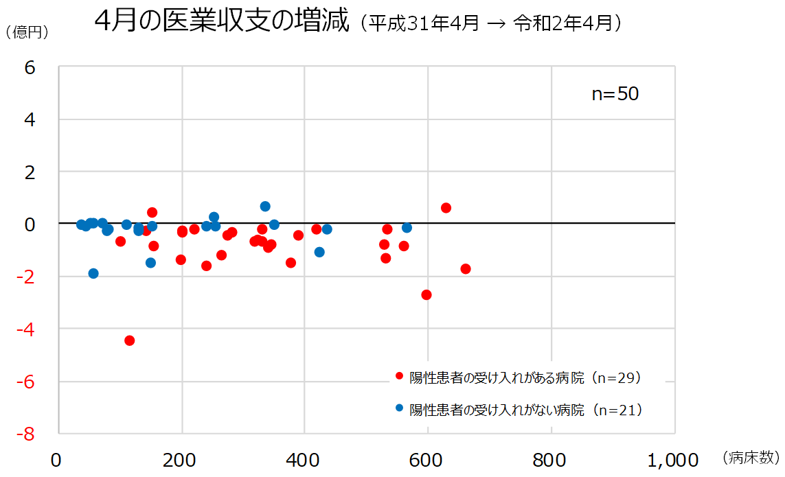 財政的には、多くの病院で様々な要因から経営の悪化がみられた。新型コロナウイルス感染症患者受け入れ病院では、4月の1ヵ月間をみると、前年に患者制限をしていた2病院を除き、全病院での収支が悪化していた。悪化度も非受け入れ病院に比べ大きい。また3月より4月の方が、経営上的の影響が進んでいる。国の支援も第2次補正予算でさらに行われると聞くが、医療体制確保のためにもしっかりとした対応を望みたい。